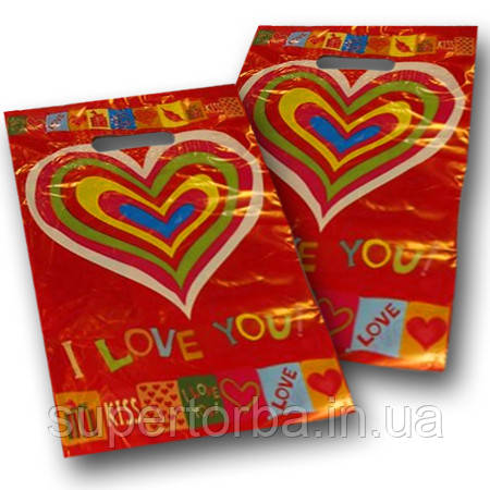 Пакет із прорізною ручкою розмір 25х35 "Різнокольорове серце" 50 шт/уп.